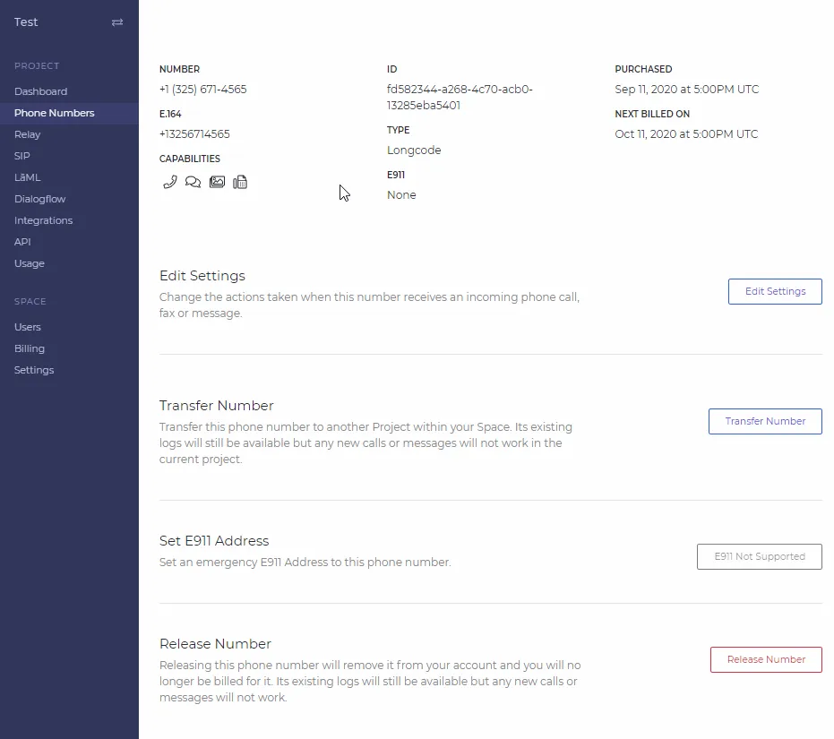 In the Edit Settings page, the number can be given a name and set up Voice/Fax & Messaging setting.